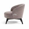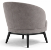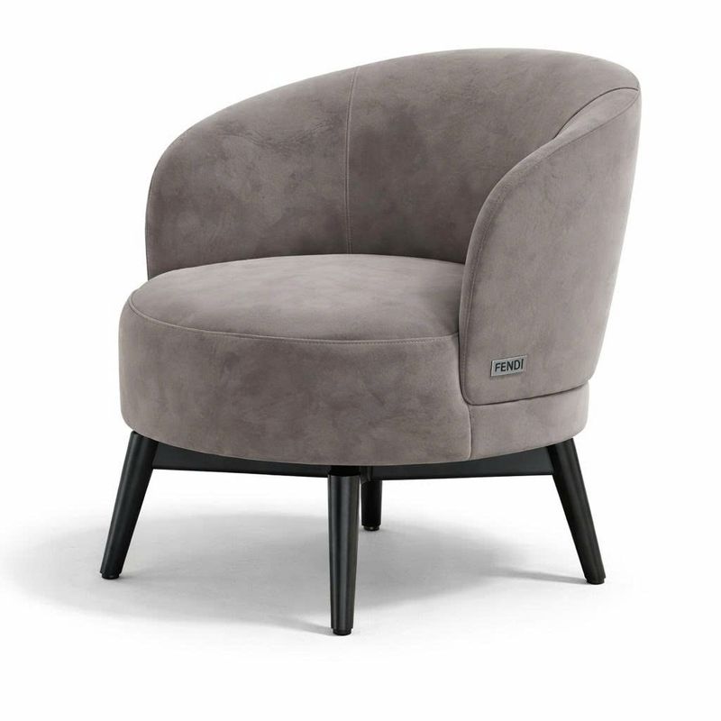 Ghế bành bọc da lộn màu xám taupe, thiết kế bo tròn mềm mại với tựa lưng liền tay vịn ôm trọn người ngồi. Chân ghế gỗ sơn đen thanh thoát, tạo cảm giác hiện đại và sang trọng.